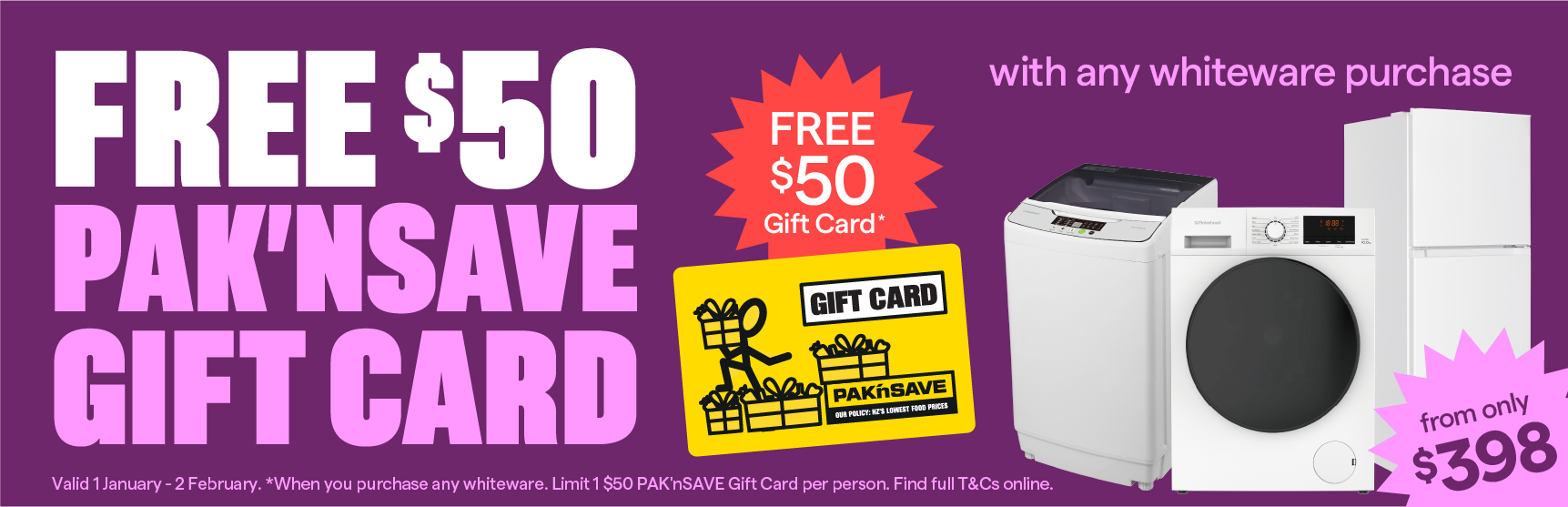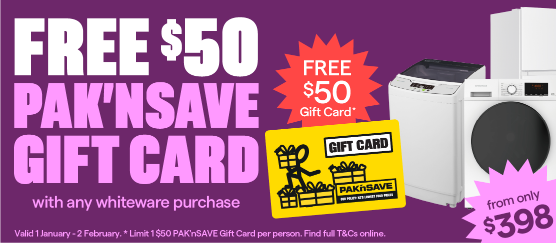 Get a FREE $50 Pak'nSave Gift Card with ANY whiteware purchase. For a limited time only. T&Cs apply.